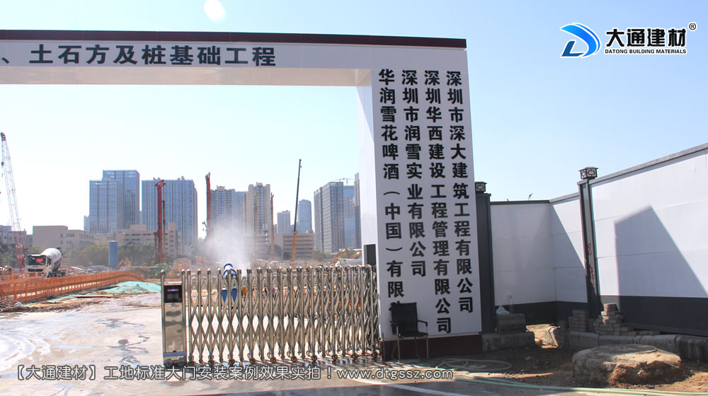 雪花啤酒(中國)有限公司,深圳雪花啤酒廠片區(qū)基坑支護、土石方與樁基工程施工大門定制安裝,  位于廣東省深圳市寶安區(qū)新安街道留仙三路,由深圳市深大建筑工程有限公司施工,工地大門選擇深圳市大通建材有限公司定制的鋼結(jié)構(gòu)工地施工大門,工地大門已經(jīng)安裝完成,現(xiàn)場實拍照片展示;