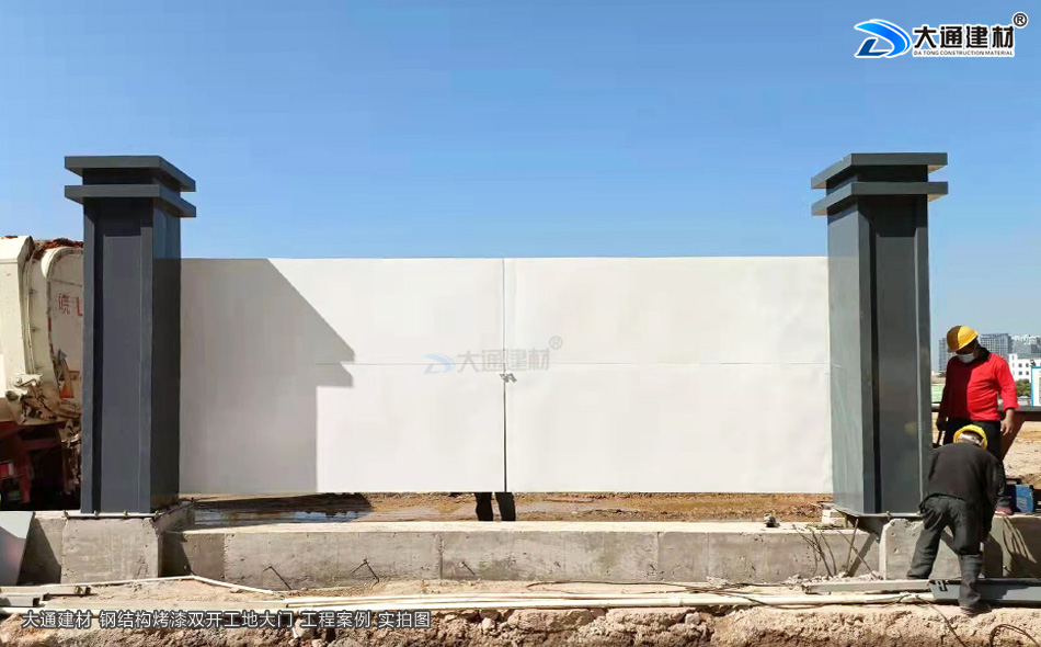 施工安全方案解決工程師,24小時在線等候您的咨詢!這個工程工地采用的是深圳大通建材生產的項目施工現場新款鋼結構烤漆工地大門,白色烤漆鋼材制作,雙開門加兩根霸氣大立柱,整個大門看起來很有氣勢吧。