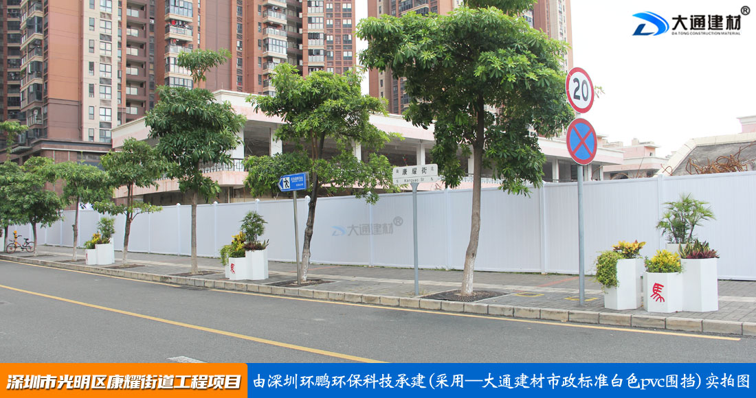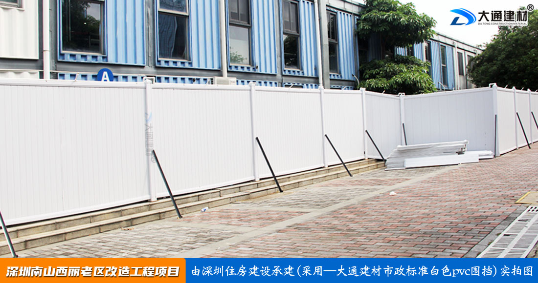 深圳市大通建材生產批發的市政標準PVC圍擋的圍擋墻板采用PVC長條版拼接,立柱、橫管均為PVC材料,內部均襯方通。立柱底板為鋼板,并加斜撐受力,來保證PVC圍擋抗風力更強、更安全穩固。大通建材常規款PVC圍擋尺寸長3mx高2.5m、長3mx高2.2m、長3mx高2m 其它PVC圍擋尺寸可按實際需要進行定制生產。